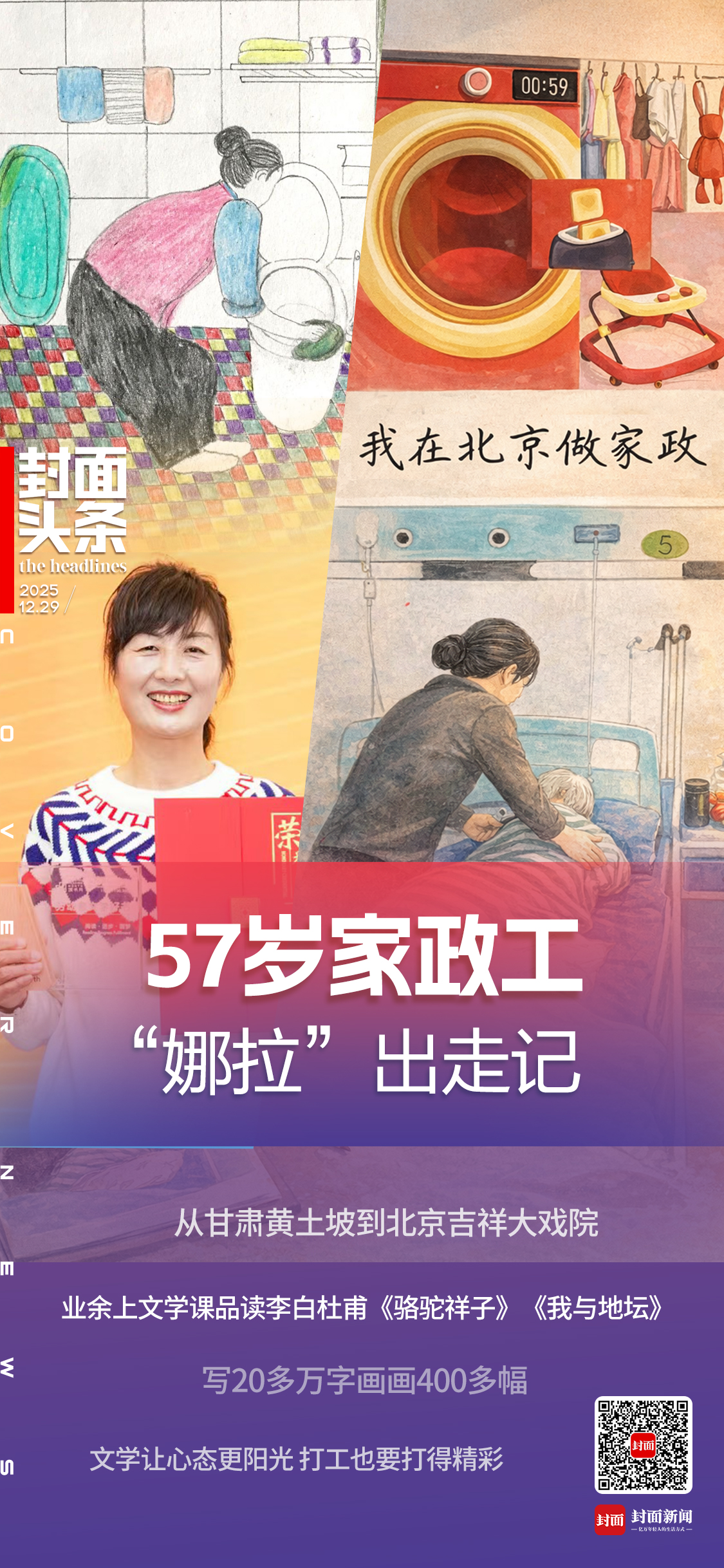 2025年冬,在北京大兴。来自甘肃的57岁家政女工李文丽跟封面新闻记者聊起了李白、杜甫以及《骆驼祥子》《我与地坛》。从“认为我方是寰球上最横祸的女东谈主”,到“打工也要打得精彩一些”,文体与艺术成了她生活的“光”,文体和艺术给了她面临生活的勇气和力量,“文体让咱们愈发烧爱这世上总共值得去爱的一切。”当被问及想对宽绰打工姐妹说些什么时,她的冷落诚恳而坚韧:“不管在什么场地,处在什么样的窘境中,一定不要废弃我方的景仰和遐想……哪怕只是绣一对鞋垫,惟有把心想用在你景仰的事情上,那等于很大的乐趣,感到生活有光亮。”