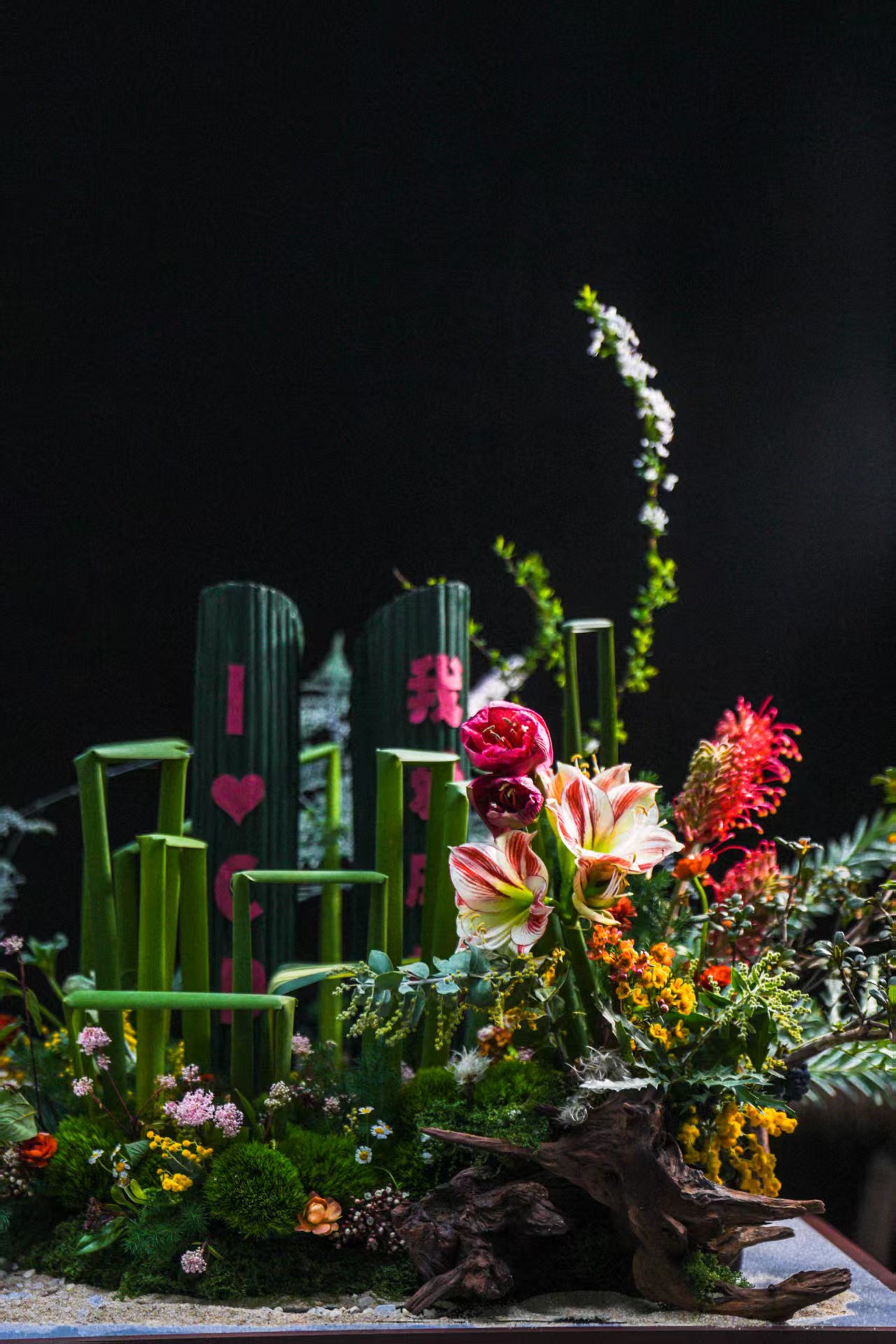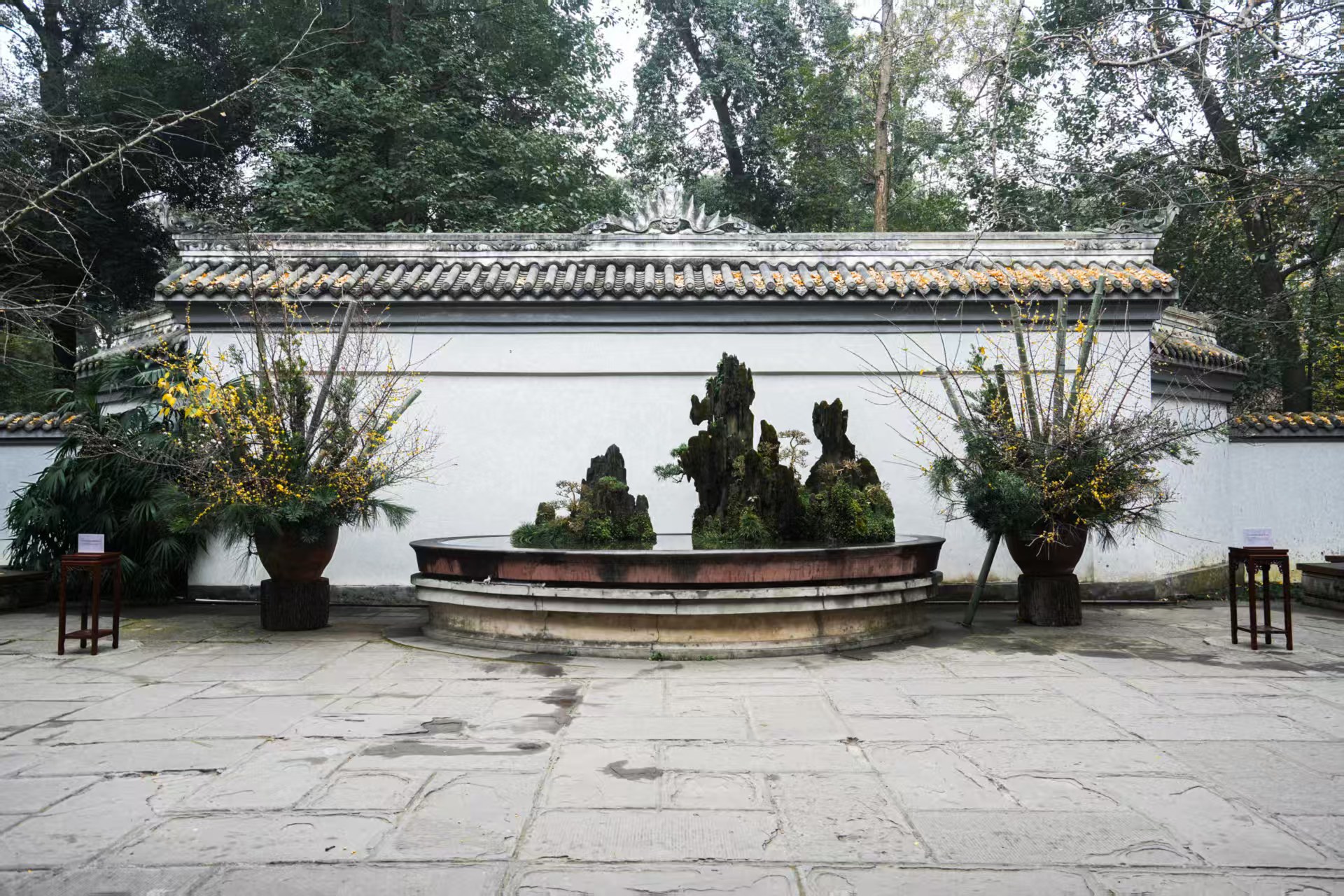 散步展览中,只见展出的作品题材丰富、立场各种,其中,一组特大型中国传统插花——《江山万里家国情》和《二梅迎春贺盛世》,号称这次艺术展的扛鼎之作。这两件作品排列于杜甫草堂兰园两棵千年古银树下,以梅花、蜡梅等传统报春花材,搭配罗汉松、马尾松、毛竹等巴蜀特质植物,以花艺勾画春和景明之象,尽显勃勃守望、情状万千之态。作品《破腊探春》则以杜甫《江梅》诗句 “梅蕊腊前破,梅花年后多”为创作灵感,取梅花、菊花等制为花篮,身手娴熟精妙。